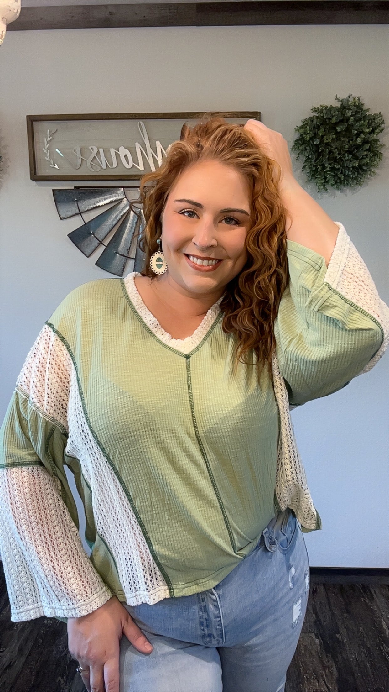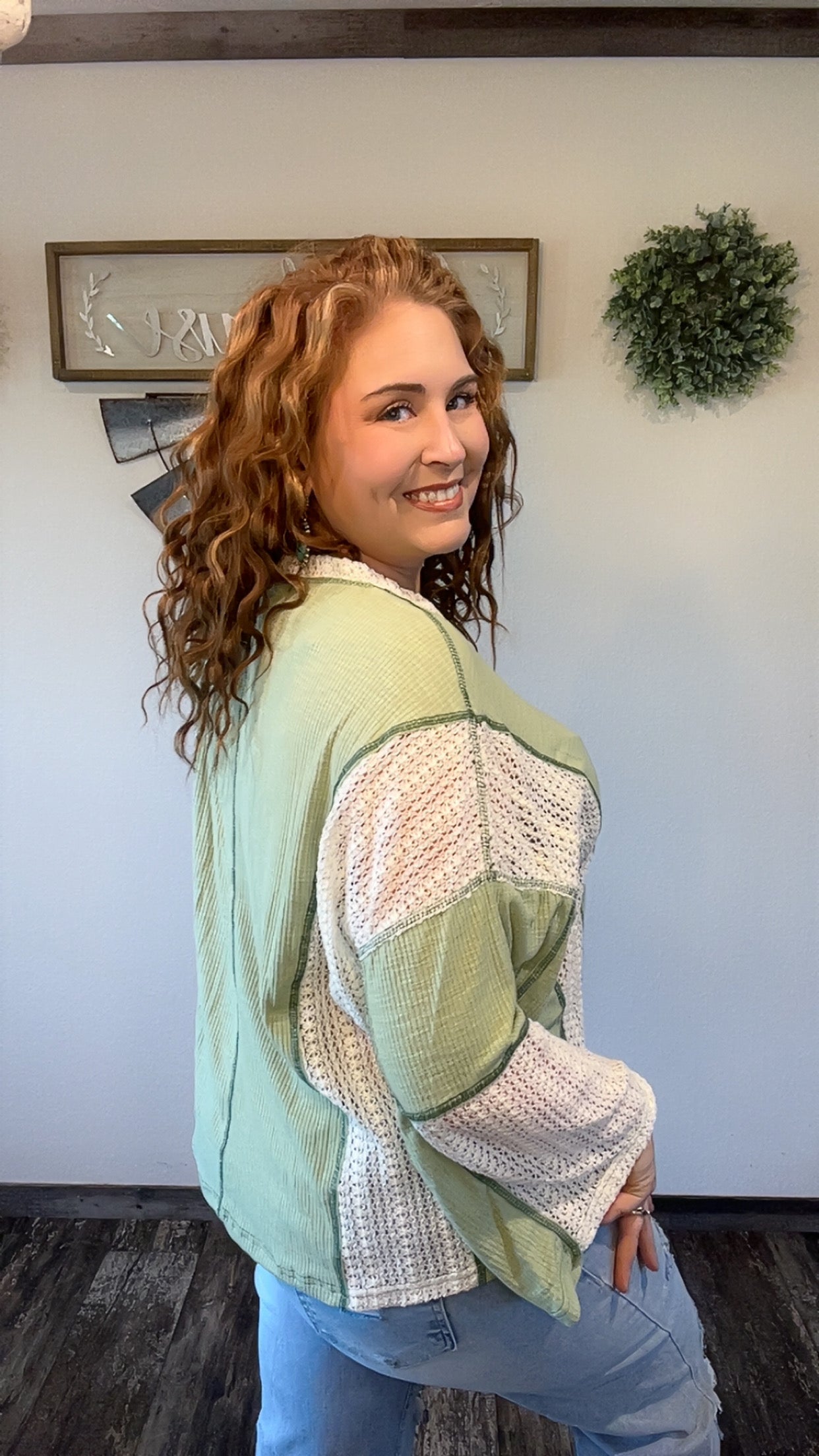 Grass green crochet detail exposed seam high low loose fit top