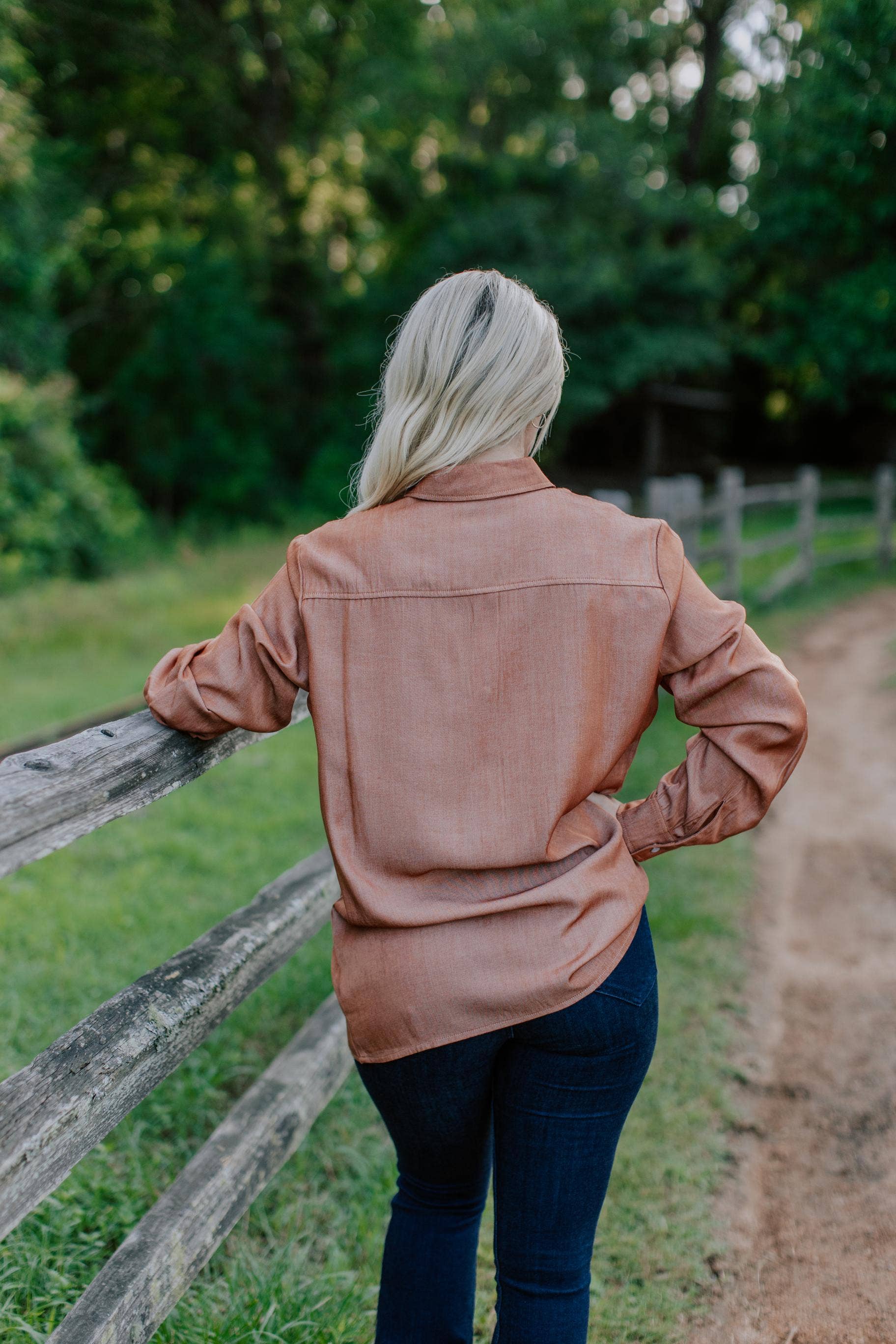 A western staple with a modern edge—this rust orange pearl snap shirt is made for everything from rodeo nights to everyday wear. Featuring a chest pocket, crisp collar, and shiny pearl snaps, it’s a versatile piece that pairs easily with denim, skirts, or boots. The rich rust hue adds that perfect pop of color while keeping it classic cowgirl chic.