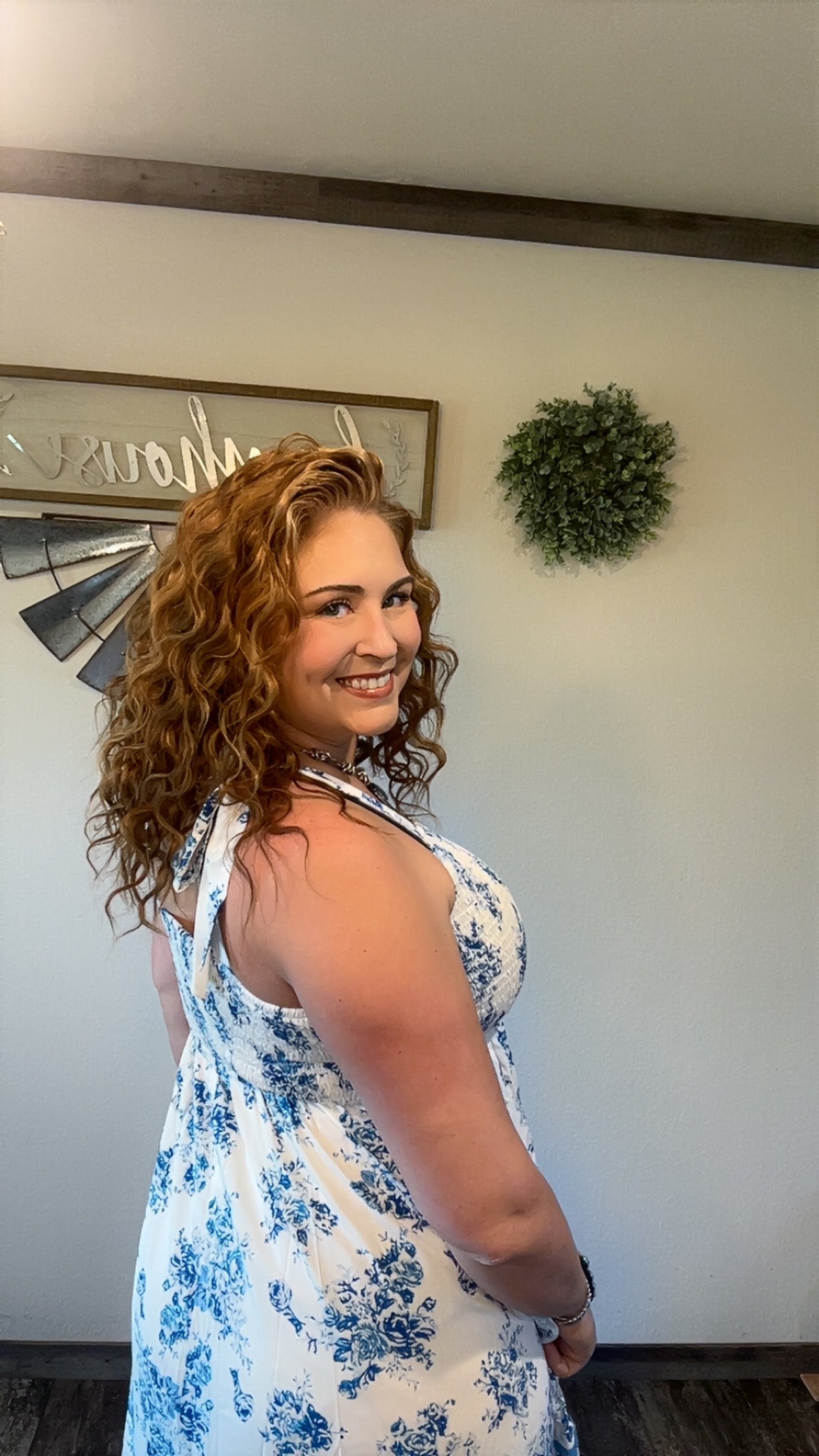 Sky blue floral print smocked knot shoulder sleeveless long dress
